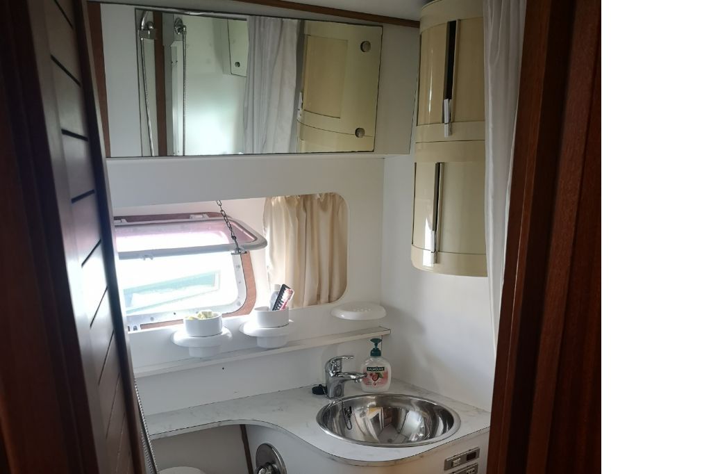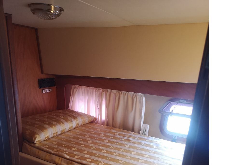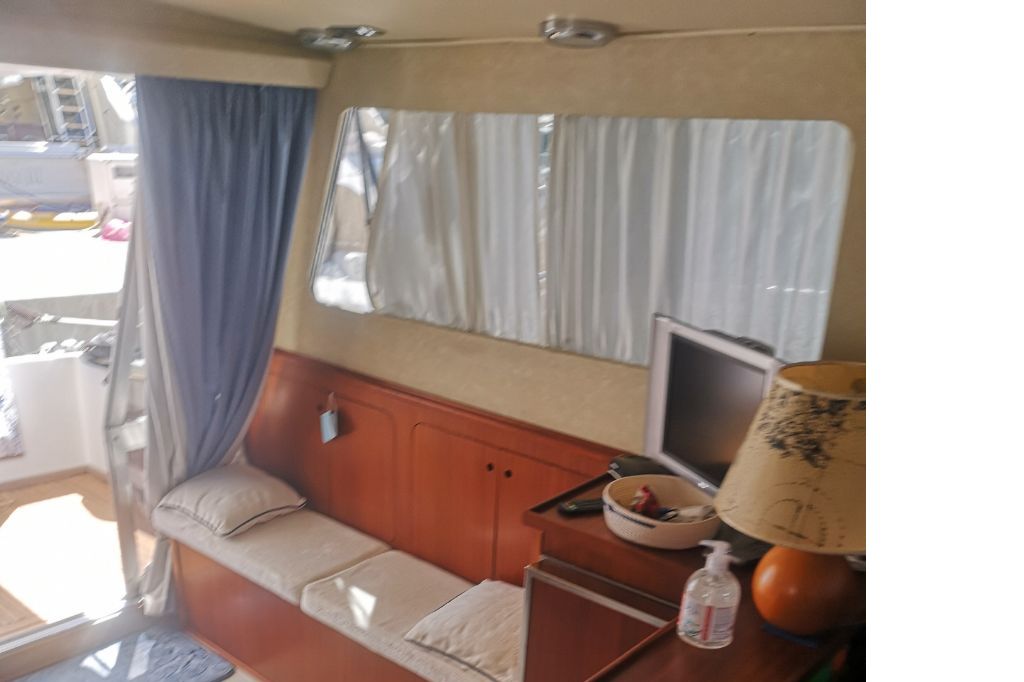 Rivestimenti paratie in mogano, pannellatura soffitti, tappezzerie, tende finestrature e porta di accesso, copriletti, plancia in radica, salotto e sedute in spugna. Impianto luci a led.