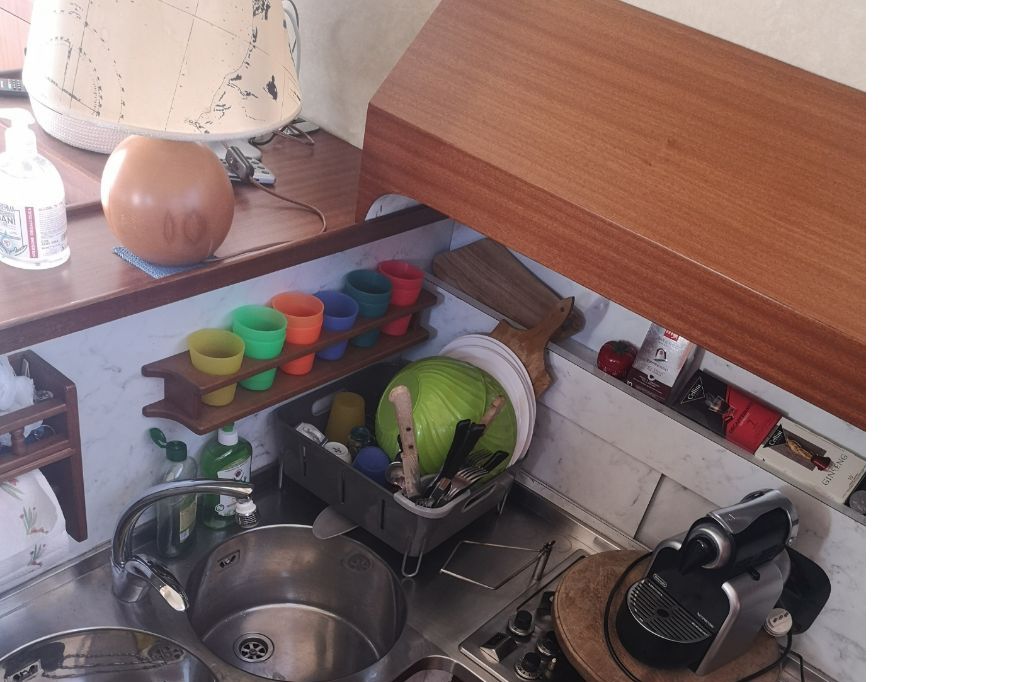 Cucina con doppio lavello in acciaio inox, cambusa, fuochi a gas con bombola alloggiata all’esterno, cappa estrazione fumi