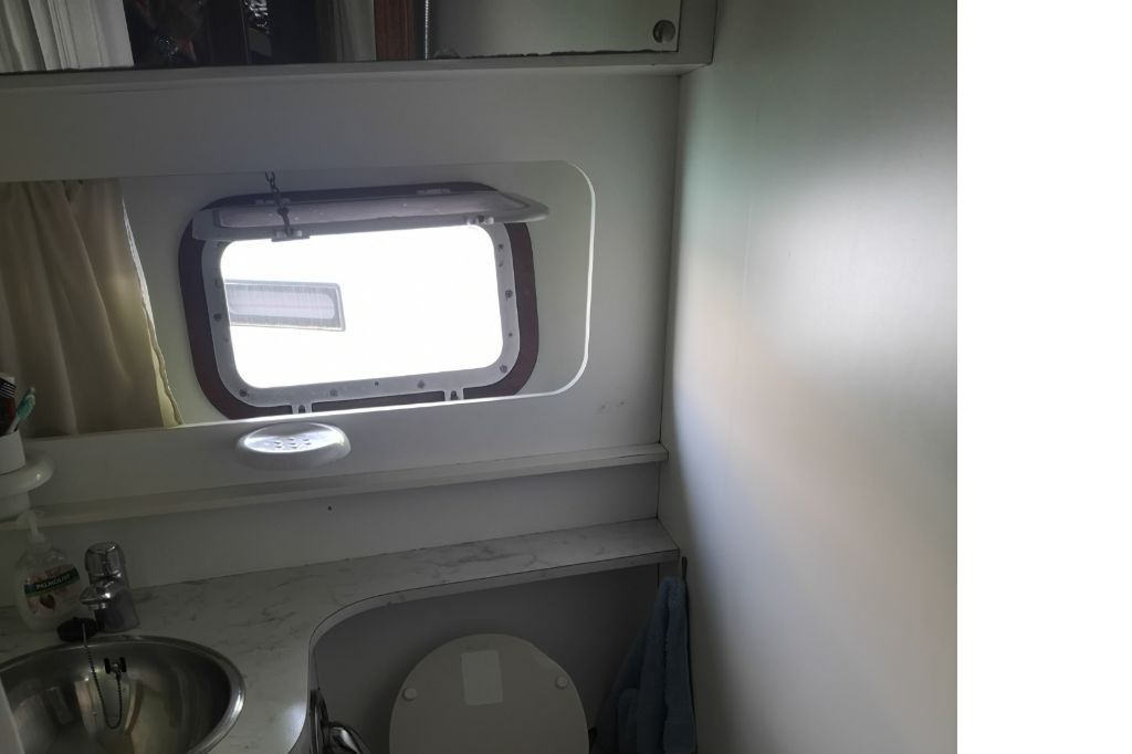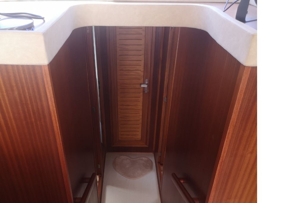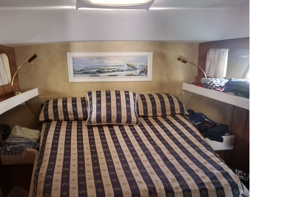 Cabina armatoriale con letto matrimoniale a materasso in lattice (h. cm 15 in density e memory), bagno e doccia, armadi cassetti e ripostigli