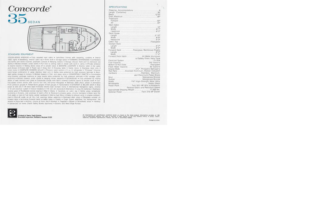 noto Cantiere americano - Concorde Owens - nell'anno 1970 è una piacevole "Corvette Sedan" tipica linea americana dell'epoca, ampio pozzetto molto confortevole e adatto alla pesca d'altura o navigazione di piacere, di prua la tuga bassa di importanti dimensioni offre un notevole prendisole di grande capienza, gli spazi per le manovre con il verricello salpaancora sono adeguati e comodi.All'interno gli spazi sono divisi in una cabina separata a prua, un ampio bagno con box doccia, grande piano per lavello e cucina, frigorifero di dimensioni casalinghe, una dinette con 4 posti a sedere trasformabile in letto e di fronte un comodo divano anch'esso trasformabile in letto a 2 piazze. Diversi armadi e gavoni completano l'arredo interno di classico disegno all'americana.